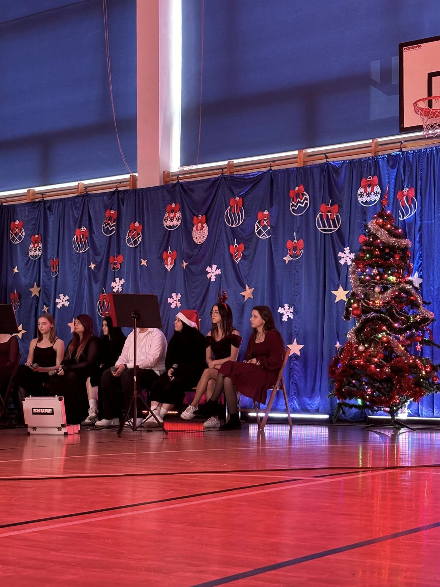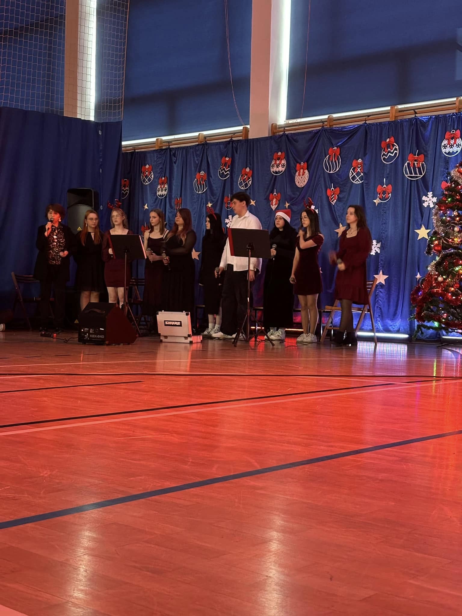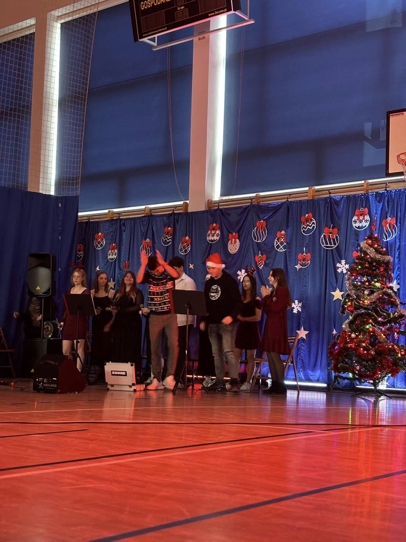 Uczniowie i pracownicy szkoły, przed rozpoczęciem, przerwy świątecznej, wraz z sekcją muzyczną zaśpiewali kolędy i pastorałki,
