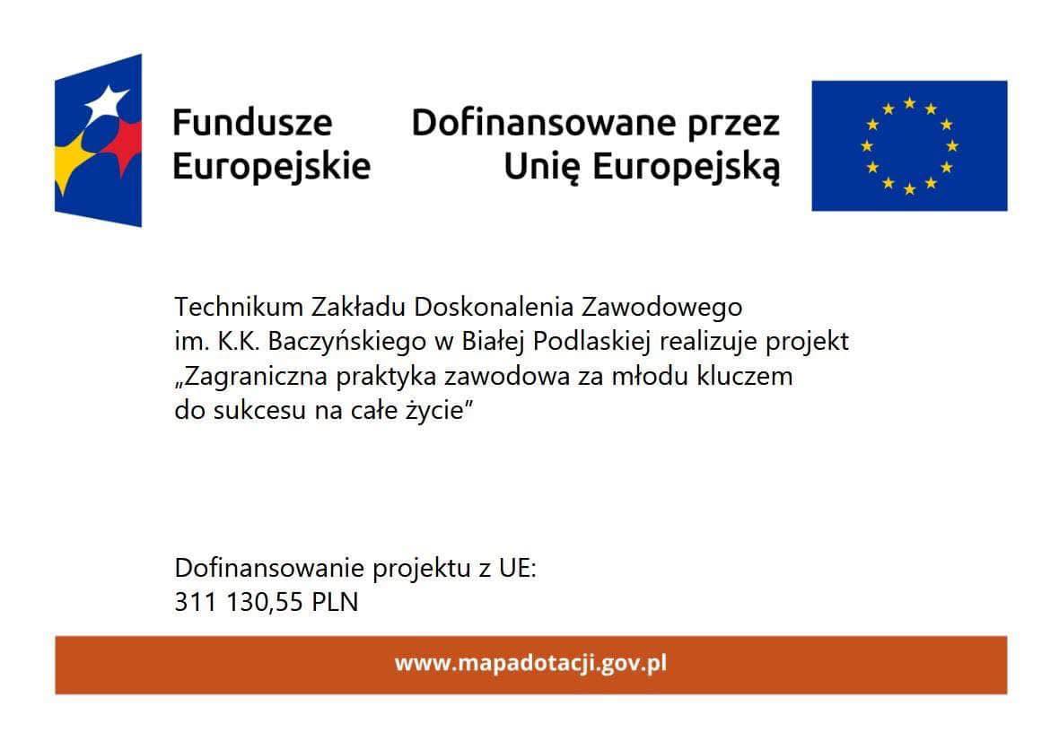 Projekt „Zagraniczna praktyka zawodowa za młodu kluczem do sukcesu na całe życie” o numerze 2024-1-PL01-KA122-VET-000235212 jest realizowany w ramach projektu „Zagraniczna mobilność edukacyjna uczniów i absolwentów oraz kadry kształcenia zawodowego” współfinansowanego przez Unię Europejską ze środków Europejskiego Funduszu Społecznego+, w Programie Fundusze Europejskie dla Rozwoju Społecznego 2021-2027 realizowanego na zasadach Programu Erasmus+.
