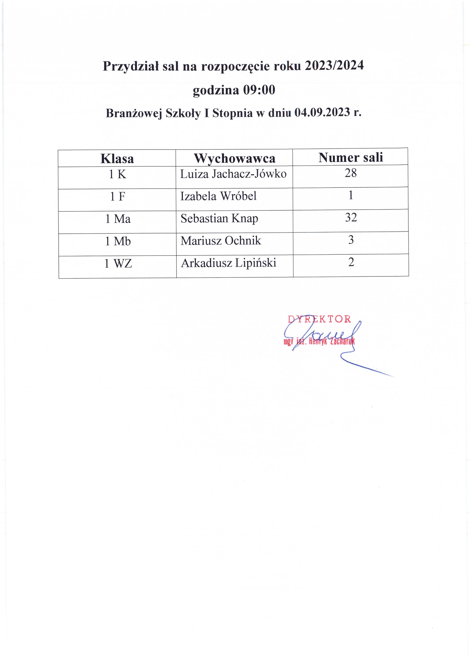 Przydział sal na spotkanie wychowawców klas z uczniami po rozpoczęciu roku szkolnego 2023/2024
