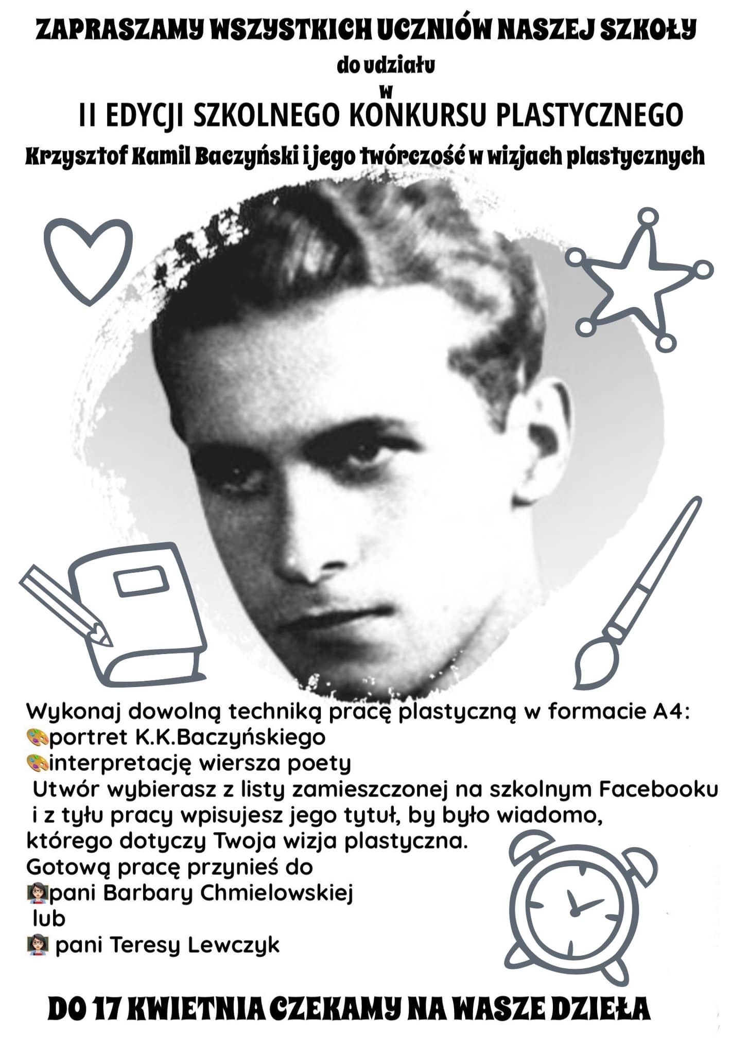 Wykonaj portret Krzysztofa Kamila Baczyńskiego lub zinterpretuj plastycznie jeden z jego utworów z listy zamieszczonej poniżej: